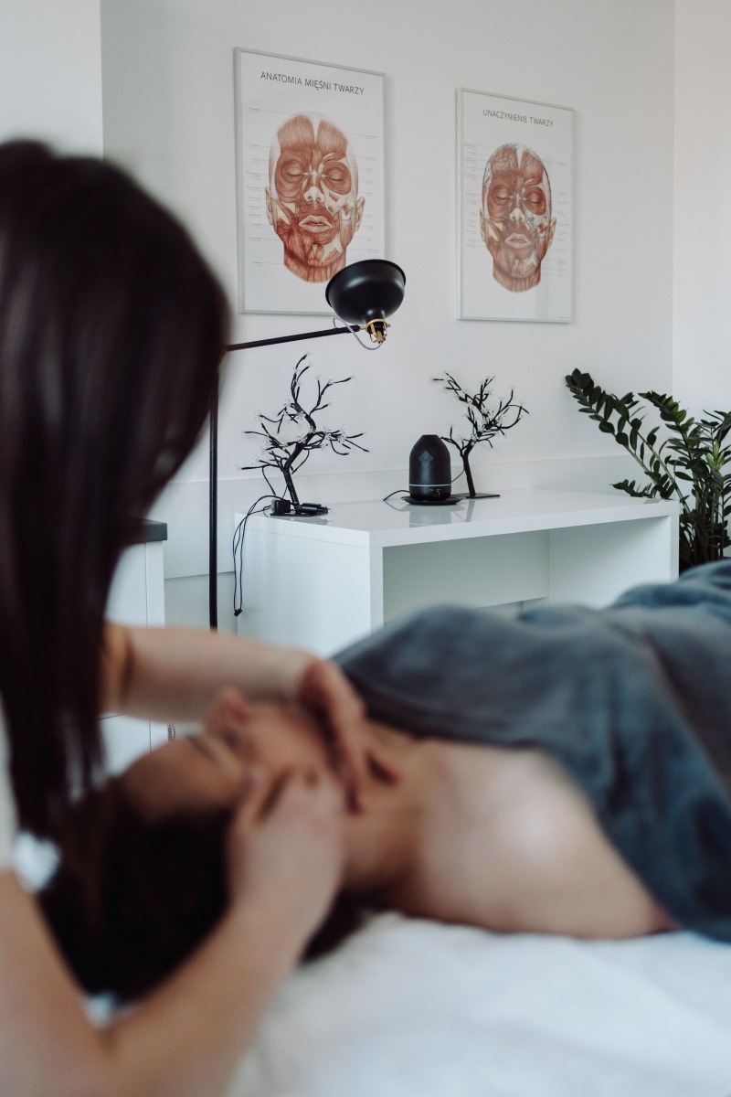 - likwidacja napięcia mięśniowego w obrębie dekoltu, twarzy i czepca,